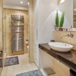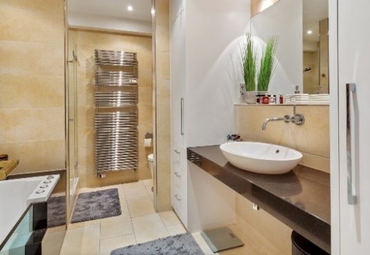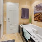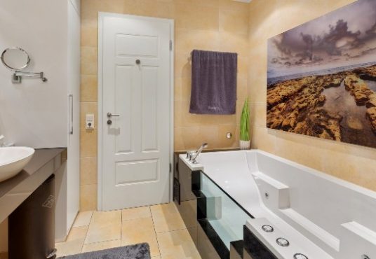 mit einer übergroßen Whirlpool-Wanne, verchromten Handtuchheizkörper und Dusche.