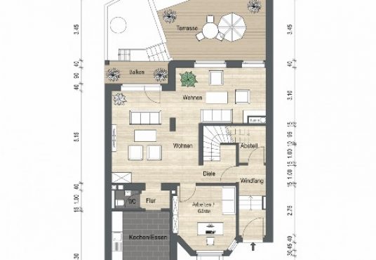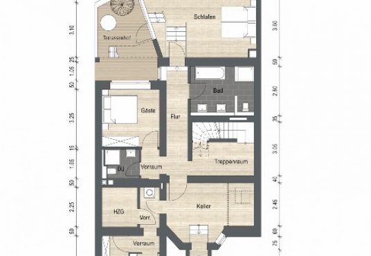 Die Erdgeschoss-Ebene besticht mit einem großzügigen Wohn-Essbereich, der zwar offen gestaltet ist, aber aufgrund von Durchbrüchen und einer Säule eine klare Gliederung der Nutzungsbereiche aufweisen kann. Der eingebaute Kamin verspricht gemütliche Abende am knisternden Feuer. Die beiden Terrassen zum Innenhof begeistern mit