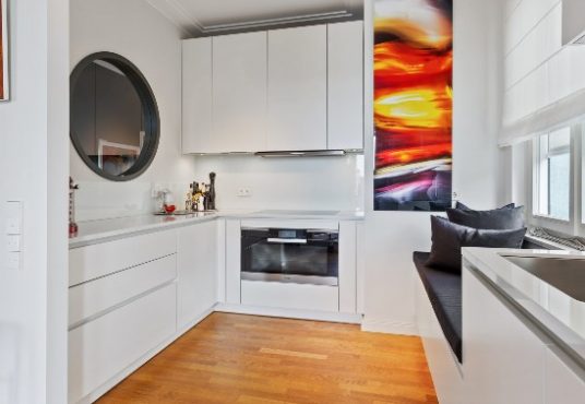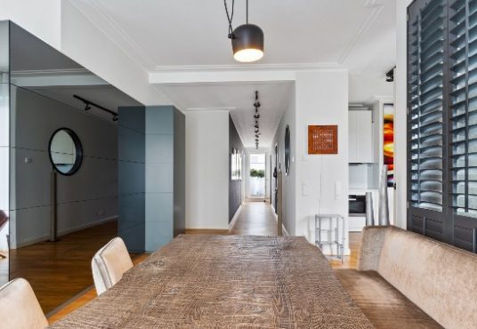 Alleinlage. Betritt man die Wohnung, lässt man den Alltag hinter sich. Transparenz, großzügige Räume, extra hohe Decken, edles Parkett, maßgefertigte Möbel und eine exklusive